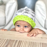 This soft and stretchy organic cotton knit baby hat features Sun & Song's exclusive Dinosaur design, with grey dinosaurs and navy blue eyes roaming on a crisp white background with chartreuse green accents. With professionally serged seams and a nice stretch to the fabric, this hat will be cozy and snug on your little one. This picture perfect accessory is available in 2 sizes for your quickly growing bundle of joy!
