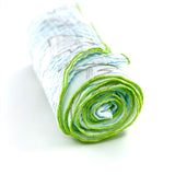 This lightweight organic cotton muslin baby blanket features Sun & Song's exclusive Sharks & Waves design, with grey sharks in a wavy blue ocean and bordered in chartreuse green. There are one million uses for this colorful baby blanket from newborn swaddle to nursing cover up to your toddler's favorite snuggle blanket. Mom can even use it as a wrap or scarf! With professionally serged edges and a breathable muslin fabric, your little one will feel snug and secure without overheating. The gauze has a crinkly look and feel and only continues to get softer as it is used and washed.
