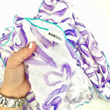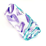 This lightweight organic cotton muslin baby blanket features Sun + Song's Wild Hearts fabric. Our Wild Hearts design features a collection of hand painted and imperfect hearts in rich purple on a crisp white background with teal blue thread around the edges. This design was inspired by Kimi's love for finding heart shapes in nature and where you're least expecting them. There are one million uses for this colorful baby blanket from newborn swaddle to nursing cover up to your toddler's favorite snuggle blanket. Mom can even use it as a wrap or scarf! With professionally serged edges and a breathable muslin fabric, your little one will feel snug and secure without overheating. The gauze has a crinkly look and feel and only continues to get softer as it is used and washed.