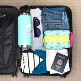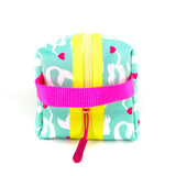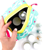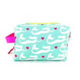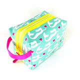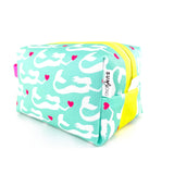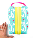 Boxy never looked so beautiful! This structured travel toiletry bag is fabricated with Sun + Song's exclusive Mystic Mermaids fabric. Our Mystic Mermaids design features crisp white mermaids holding hot pink hearts and swimming on an aqua blue background. These beautiful sea creatures have become symbols of femininity, uniqueness and non-conformity. The lemon yellow zipper wraps over the top and down part of each side, opening wide to reveal a charcoal grey waterproof canvas interior. Grab this pouch by its hot pink handle and you're good to go!