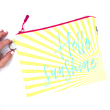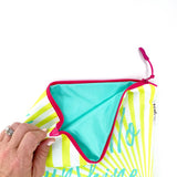 Don't settle for a boring bag! This highly functional and lively looking water-resistant wet bag is produced using Sun + Song's exclusive Hello Sunshine fabric. Our Hello Sunshine design features brushed text (Hello Sunshine) in aqua blue over lemon yellow rays of sunshine. Open up this bag's hot pink zipper to find a fun pop of aqua blue waterproof fabric lining the inside!
