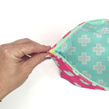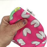 It's time to get lucky! This fortuitous special edition zipper pouch features Sun + Song's exclusive Fortune Cookie design, with grey and aqua blue fortune cookies on a bright pink background. Even better: each bag has its own unique fortune printed on the interior fabric - just for you! *The Fortune Cookie fabric is only available in this special edition size bag and you won't see your special fortune until your bag arrives in the mail - how fun?!?!