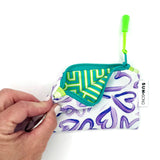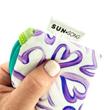 Keep happiness (and $20) right at your fingertips! This cute and compact keychain wallet is carefully crafted from Sun + Song's exclusive Wild Hearts fabric. Our Wild Hearts design features a collection of hand painted and imperfect hearts in rich purple on a crisp white background. This design was inspired by Kimi's love for finding heart shapes in nature and where you're least expecting them. Unzip the teal blue zipper and - surprise - you'll find another vibrant pattern lining the inside!